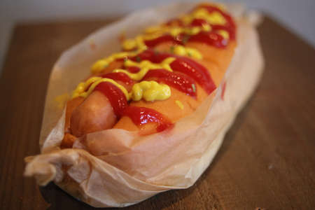 Hot dog with mustard and ketchup in a paper bag on a wooden table