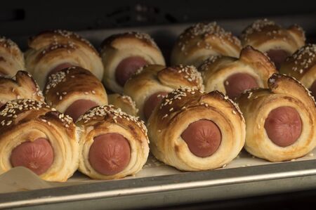 Baked sausages in dough with sesame on the baking tray. Fresh homemade bakery.