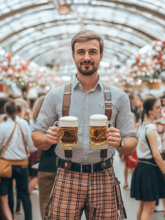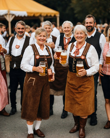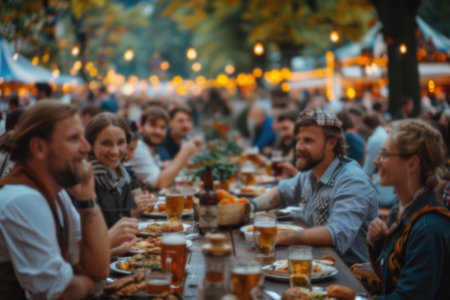Immerse yourself in the lively atmosphere of a vibrant Oktoberfest celebration, as people joyfully dance and sing along to the energetic music in the bustling beer hall. Feel the excitement and embrace the spirit of this lively event