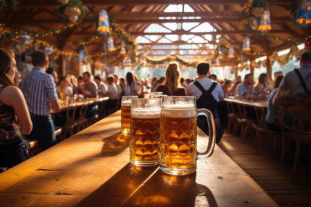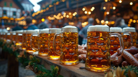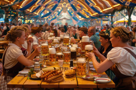 A bustling marketplace at the Oktoberfest in Germany, overflowing with steins of beer, savory sausages, and traditional Bavarian attire.