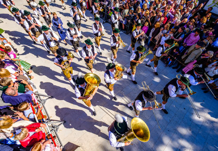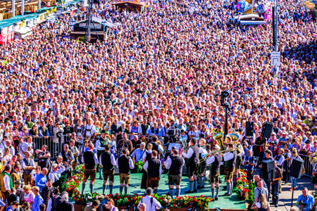 Munich, Germany - September 29: participants and musicians at the traditional open-air concert on the oktoberfest in munich at September 29, 2019
