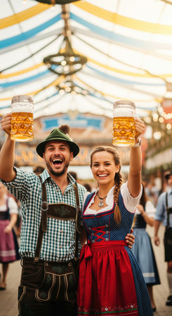 A smiling man and woman in traditional Bavarian attire, lederhosen and dirndl respectively, raise large beer steins in a toast. They are at an outdoor festival, likely Oktoberfest, with colorful pennants strung overhead and a crowd visible in the background. The couple is happy and celebrating.
