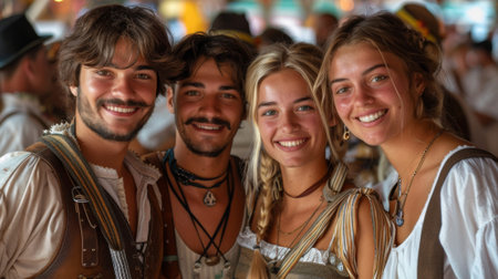 Joyful friends in traditional Bavarian attire toasting beer at Oktoberfest.