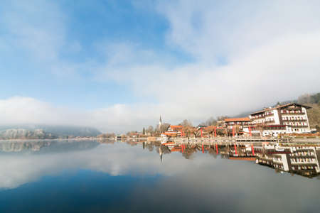 beautiful reflection of blue sky and houses on Schliersee lake. landscape