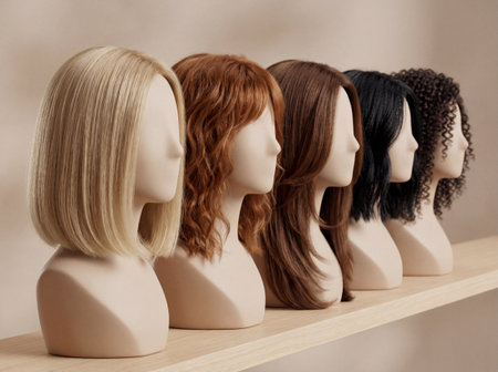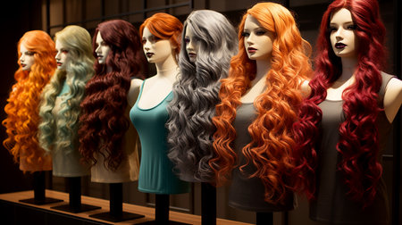 Set of modern women's youth wigs worn on mannequins in a store, illustration of fashion trends in appearance. AI generated.