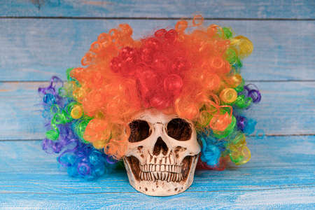 The skull in a yellow wig is adorned with blue Christmas tinsel.