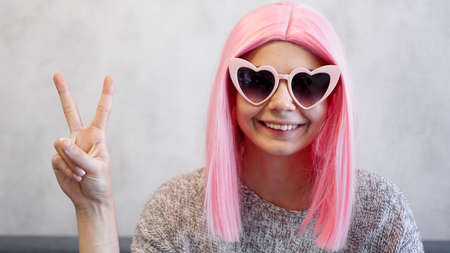 Portrait of a happy cheerful girl showing peace gesture. Woman wearing heart-shaped glasses and pink wig - positive portrait