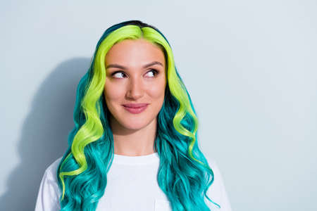 Photo of charming dreamy vivid ombre hair lady wear t-shirt looking empty space isolated white color background
