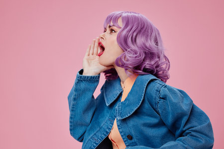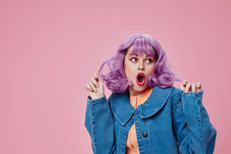 Beautiful fashionable girl wavy purple hair blue jacket emotions fun studio model unaltered