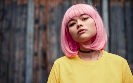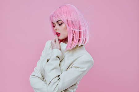 Beautiful fashionable girl modern style pink hair Red lips fashion color background unaltered