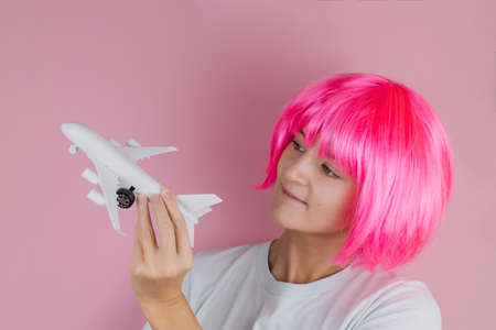 attractive young woman with pink hair holding white plane toy on a pink background,travel concept