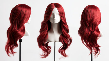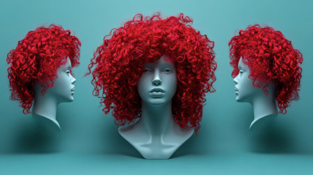 This artistic image features a vibrant red curly wig displayed on a mannequin head from three angles, showcasing its lively texture and unique style. Perfect for fashion and beauty themes.