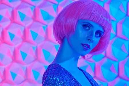 Portrait of a beautiful young girl with silver make-up posing in pink wig in a colorful blue and pink light. Party style. Beauty and fashion.