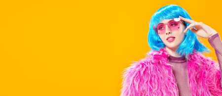 Portrait of an attractive party girl with bright pink makeup and blue wig wearing pink fur coat and sunglasses on a yellow background. Make-up and cosmetics, hairstyle. Fashion girl. Copy space.