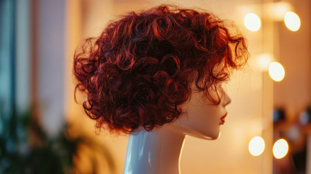 A short curly wig in dark red on a mannequin head, positioned under warm studio lights.