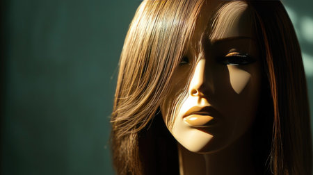 A mannequin head wearing a straight dark blonde wig with a side part, illuminated by natural light.