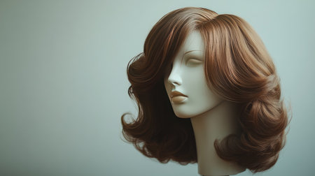 A mannequin head with a chestnut brown wig styled into loose curls for a natural appearance.
