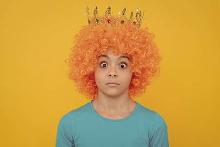 happy freaky woman in curly clown wig pointing finger, gesture and emotions. Woman isolated face portrait, banner with copy space.
