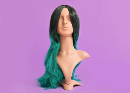 Mannequins with long hair - blue, purple, green - in a row on store display. High quality photo