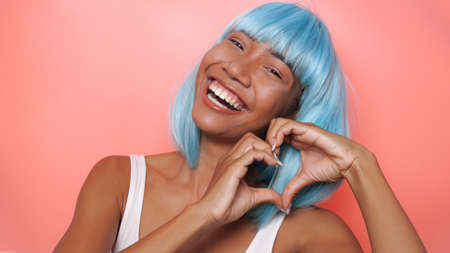 Portrait of beautiful happy Asian woman in bright blue wig posing over pink background. Girl showing heart shape with her hands