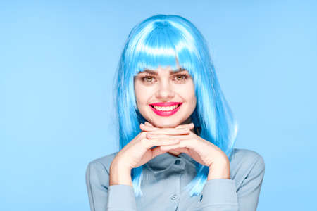 Portrait with copyspace empty place for product of pop exotic girl in blue wig having natural make up isolated on yellow background. Hair care haircare hairdo concept