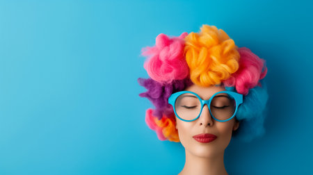 With a serene expression, a woman showcases her playful, multicolored hair while wearing bright blue glasses. The stunning blue backdrop enhances her unique and artistic spirit.
