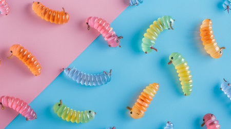 Colorful jelly worms are crawling on a blue and pink background, creating a playful and vibrant scene.