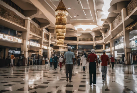 Hijab women drinking coffee and talking in the lobby of shopping mall, Female Muslim friends having coffee together in a shopping mall, AI Generated