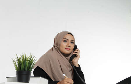 Beautiful Muslim Business woman executive wear Hijab sitting on a desk make a call
