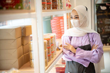 muslim business owner with mask waiting for costumer standing next to the window of her shop