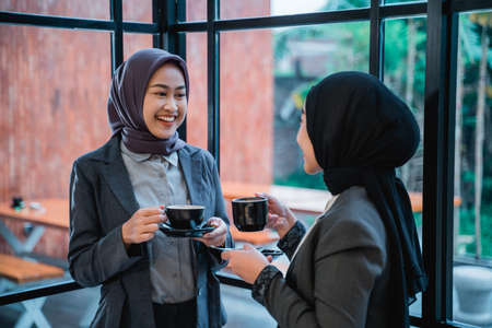 two beautiful muslim business woman wearing hijab having a conversation together at the office and enjoy a cup of coffee