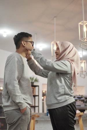 asian muslim woman giving a glass of juice to her husband at home