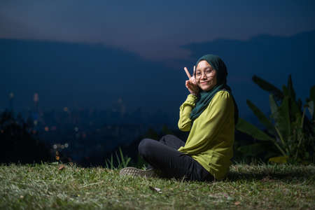 Pretty girl sitting on grass, relaxing, enjoying Kuala Lumpur city view during sunset. Portrait of young Asian woman, wearing hijab and green attire.