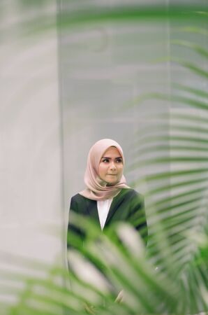 Cyberjaya, Malaysia – 25 December 2019: Fashion portraiture of young beautiful muslim woman wearing hijab.