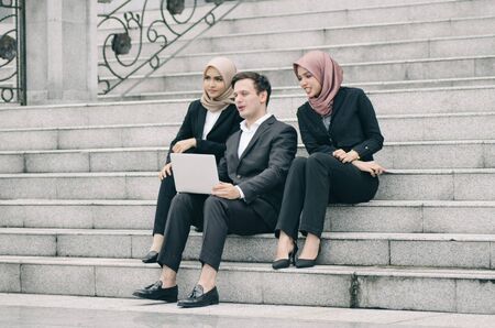 group young man and woman with hijab sitting and relax on stairs infront modern office