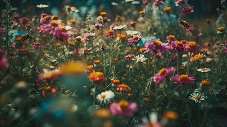 Wild flower field in foggy forest with variable colors in Spring. Spring seasonal concept. AI generated.