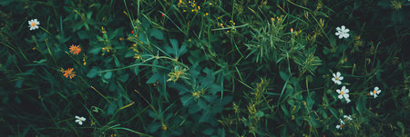 Varied meadow with wildflowers and diverse grass textures against a black background
