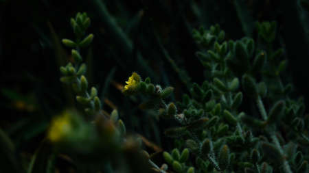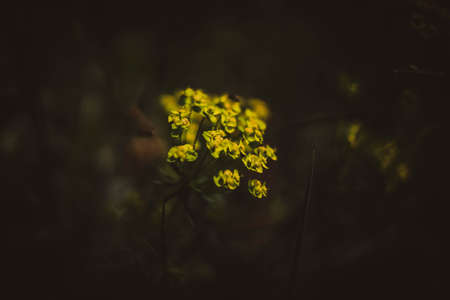 Enchanted forest, magical herbs. Green witch plants, mystical woodland backgroundб Yelloe meadow flowers