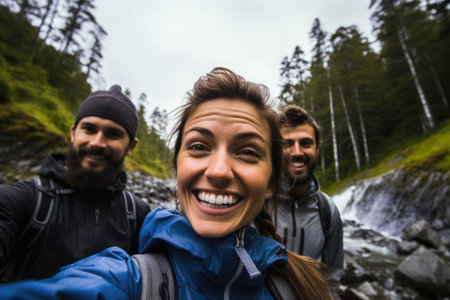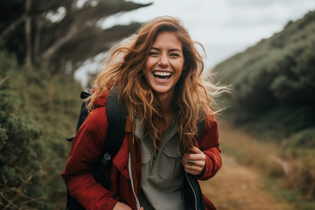 Joyful young woman with backpack hiking in nature, laughing and looking at the camera.