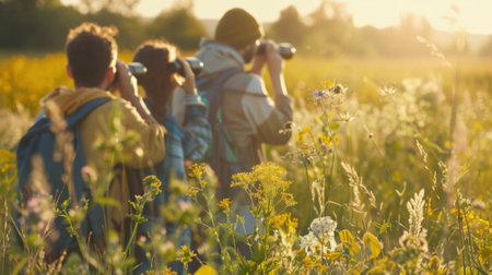 Defocused group of nature lovers huddled together binoculars in hand in the midst of a beautiful meadow