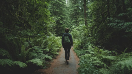 A woman is walking through a forest with a backpack on. The forest is lush and green, and the woman seems to be enjoying her walk