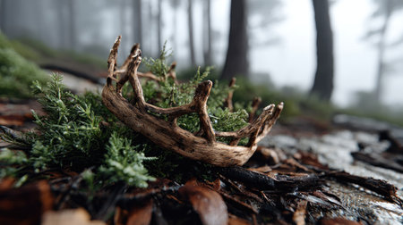 Discover a captivating scene featuring an intricate crown made of branches nestled among vibrant greenery, shrouded in gentle fog, evoking a sense of mystery and tranquility.
