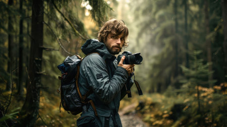 A young man passionately captures a moment with his camera in a lush forest. The image conveys artistic expression and the beauty of nature.