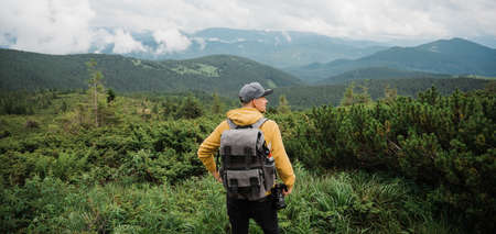 Inspiration. Horizontal photo of a photographer with a backpack and a camera who's stands in the mountains and enjoying and is inspired by the amazing mountain landscape and sky
