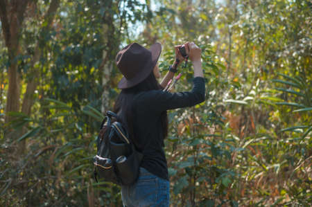 A young woman trekker taking photos of nature with camera in the woods, holidays and traveling concept.