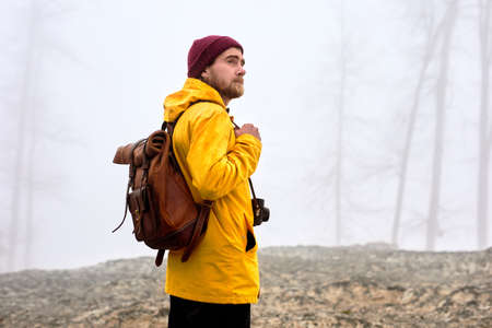 Young Male Traveler in yellow coat and hat with camera relaxing outdoors at foggy weather. vacations and Lifestyle hiking concept. Tourism, travel, trip, nature, people lifestyle concept. side view