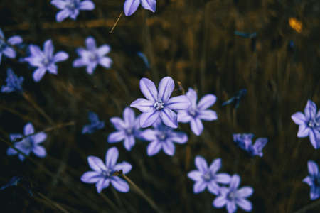Detail of one focused violet flower of aphyllanthes monspeliensis centered in the picture on an unfocused background with more flowers