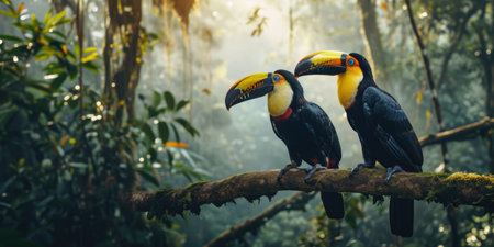 two toucan birds perched on a tree branch in a jungle, in the style of bold chromaticity.