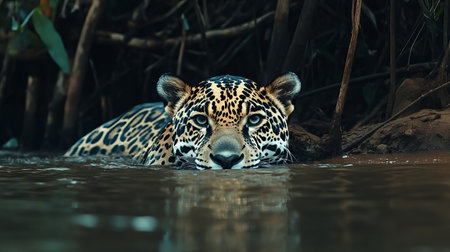 A captivating image of a jaguar resting on a riverbank, partially submerged in water. This serene wildlife scene highlights the jaguar's striking features and natural habitat.
