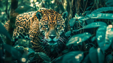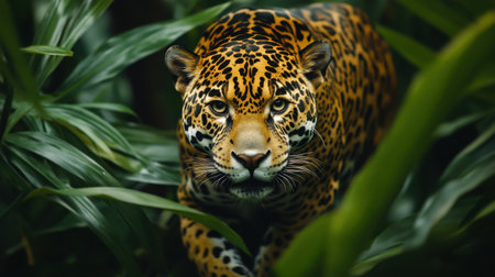 A regal jaguar showcases its stunning golden coat amidst lush greenery, embodying the beauty and strength of nature in this captivating wildlife portrait.
